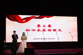 钢琴奏响第一个音符,师生们在老师的指挥下开始有条不紊的演唱。女高音部、女中音部和男声部配合默契,“我走千里,我走万里......我走冬夏,我走春秋......”,字句间充分表现出人民想要跟党走的坚定决心,契合“不忘初心,继续前进”的主题;演唱形式设计充分发挥女高音和男高音的优势,在高音处更有婉转,在低音处另赋悠扬,为歌曲添色。
