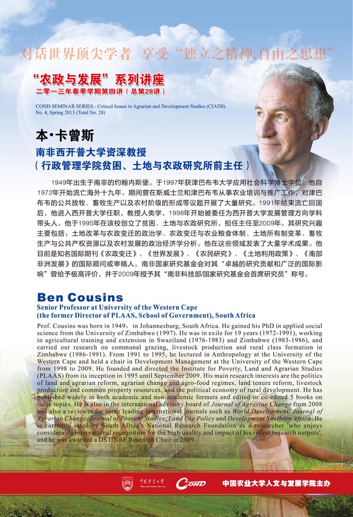 本·卡曾斯,南非西开普大学资深教授(行政管理学院贫困、土地与农政研究所前主任) Ben Cousins, Senior Professor at University of the Western Cape (the former Director of PLAAS, School of Government), South Africa |