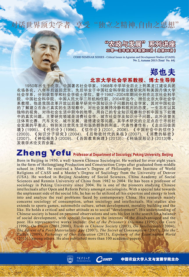 SPEAKER: Zheng Yefu,Professor at Department of Sociology, Peking University, Beijing