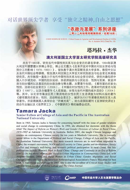 | 塔玛拉·杰华 Tamara Jacka 澳大利亚国立大学亚太研究学院高级研究员 Senior Fellow at College of Asia and the Pacific in The Australian National University