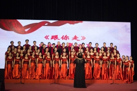 钢琴奏响第一个音符,师生们在老师的指挥下开始有条不紊的演唱。女高音部、女中音部和男声部配合默契,“我走千里,我走万里......我走冬夏,我走春秋......”,字句间充分表现出人民想要跟党走的坚定决心,契合“不忘初心,继续前进”的主题;演唱形式设计充分发挥女高音和男高音的优势,在高音处更有婉转,在低音处另赋悠扬,为歌曲添色。